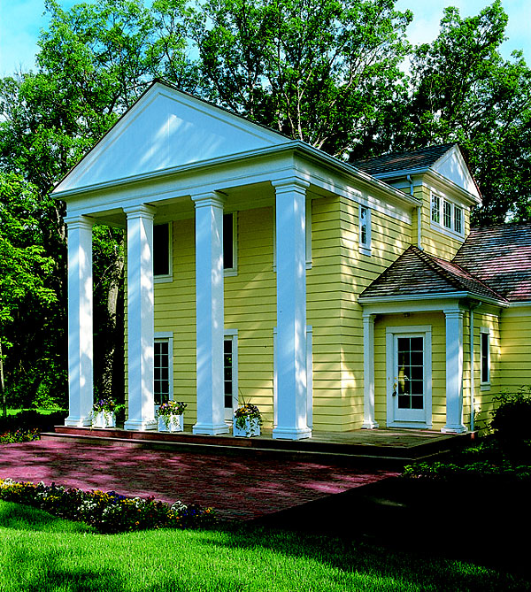 Architectural Columns Roman Doric Capitals & Bases Square Plain Non-tapered Wood Shafts Country Living House Colossal Order Front entrance with porch Photography: Jesse Walker Residential, Exterior, Showhouses