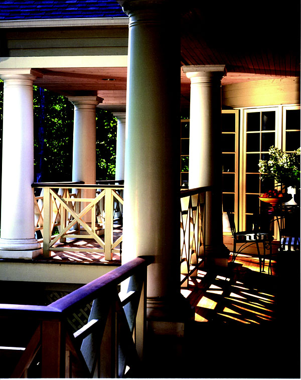 Architectural Large Stock Columns Plain Tapered Wooden Shafts 18" x 8' Columns Attached to Railing Balustrading Porch, Residential, Exterior Photography: Phillip Ennis