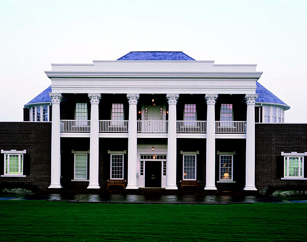 Architectural Columns Roman Corinthian Capitals & Cast Marble Attic Bases Fluted Tapered Wooden Shafts 30" x 26' 9" Residential, Exterior, Colossal Order Front Entrances Photography: Michael Lyon