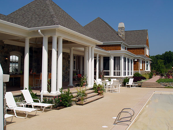 PolyStone® Fiberglass Columns Patio overlooking the swimming pool. Commercial, Exterior, Showhouses Photography: Barbara Heddinger