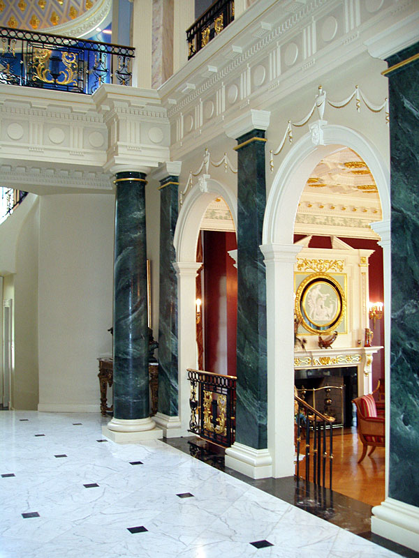 Roman Doric Plain Tapered Columns & Pilasters Faux Marble with Gold Trim Hall,Residential, Interior, Frederick Hart Photography: Barbara Heddinger