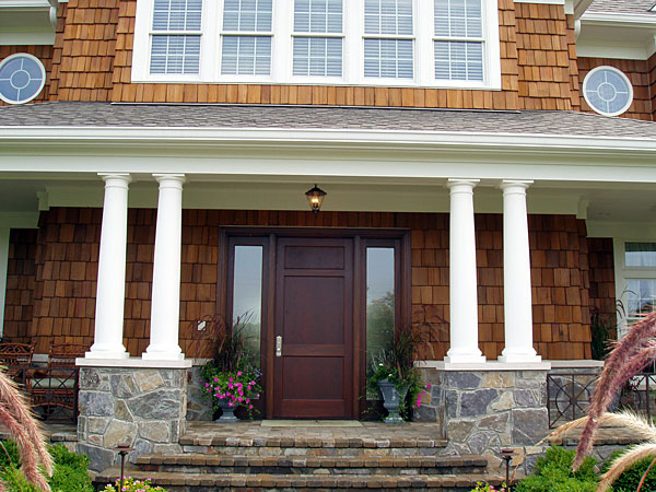 PolyStone® Fiberglass Columns Tuscan Capitals & Bases Plain Tapered Round FRP Shafts 12" x 8', 9' & 10' Indianapolis Showhouse Residential, Exterior, Showhouses Columns on pedestals on front porch. Photography: Barbara Heddinger