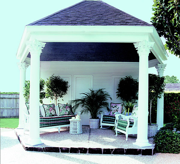 PolyStone® Fiberglass Columns Roman Corinthian Capitals & Attic Bases Fluted Tapered FRP Shafts 10" x 8' Pergola Pergolas Cabana Residential Outdoor Structures, Residential Exterior Photography: J. Draught Photography