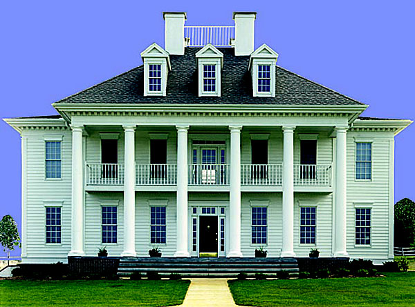 Authenic Replication Columns Tuscan Capitals & Bases Plain Tapered Wooden Shafts 12" x 9' Front Entrance Colossal Order Photography: Gordon Beall Residential, Exterior