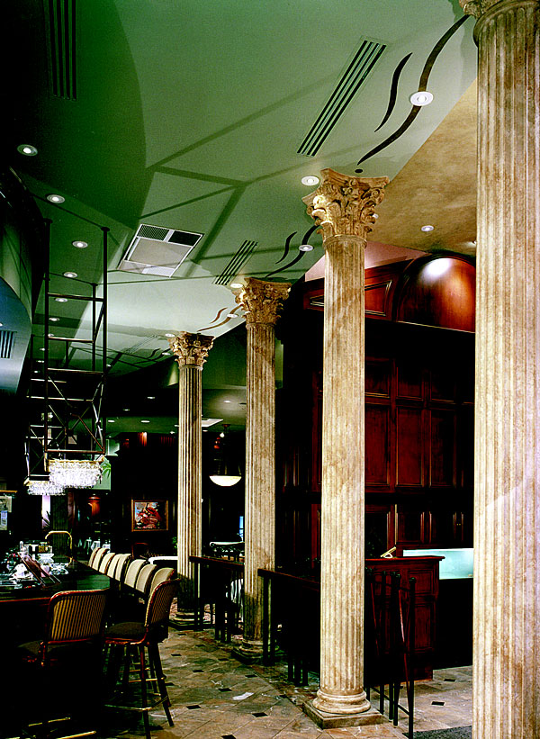 Roman Corinthian Capitals Round Tapered Fluted Wood Shafts 14" x 14' Ruth's Chris Steak House Restaurant Faux Finish Column Room Dividers for Bar Photography: Gordon Beall Commercial, Interior, Restaurants