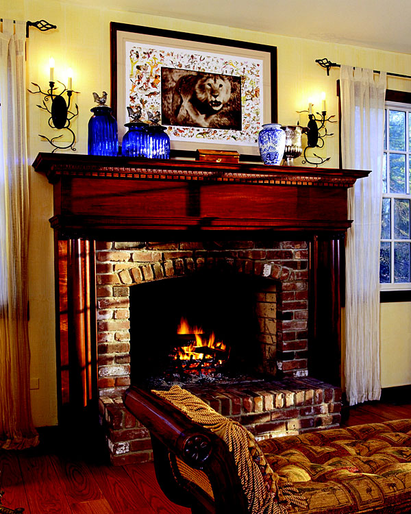 Architectural Stock Columns Roman Ionic Capitals Plain Tapered Stained Wood Shafts 10" x 4' Living room Family room Fireplace surround, Residential, Interior Photography: Phillip Ennis