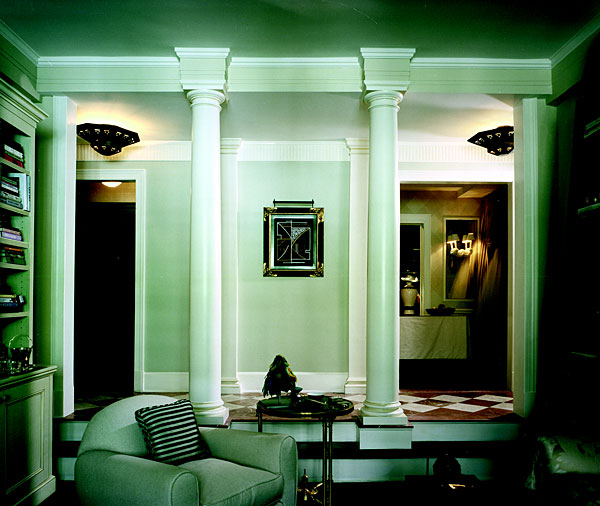 Architectural Columns Roman Doric Capitals & Attic Bases Plain Tapered Wooden Shafts & Pilasters 10" x 8' 6" Foyer or vestibule Hall looking into living room. Residential Interior Photography: Phillip Ennis