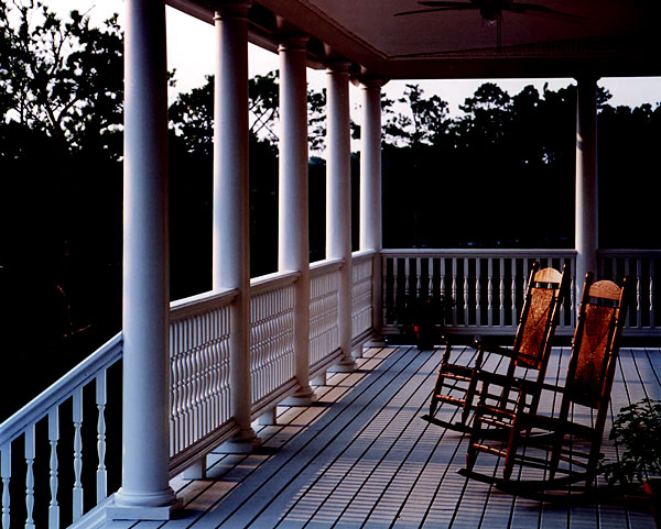 PolyStone® Fiberglass Columns Tuscan Capitals & Bases Plain Tapered FRP Shafts 10" x 10' & 14" x 14' Columns with Balusters or Balustrading on Porch, Residential, Exterior, Residential Outdoor Structures Photography: Hart/Collier Photography