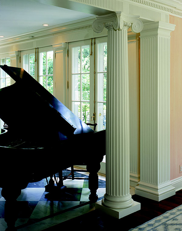 Architectural Columns Greek Angular Ionic Capitals & Attic Bases Fluted Tapered Wood Shafts & Fluted Non-tapered Wooden Pilasters 12" x 8' Photography: Glen C. Moon