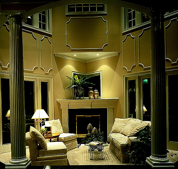 PolyStone® Fiberglass Columns Tuscan Capitals & Bases Plain Tapered FRP Shafts 10" x 9' Brown's Farm Energy Smart House Living room with Colossal Order Columns Night lightning Photography: Martinot Photo Residential, Interior, Living Room