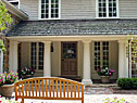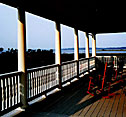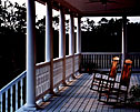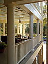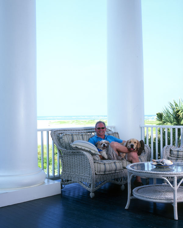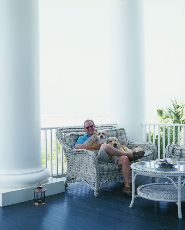 Jeffrey Davis relaxing on the porch with his companions, Rat Dog and Chadd. PolyStoneŽ Architectural Columns Tuscan Capitals & Bases Plain Tapered Shafts 32" x 19' Colossal Order Chadsworth Cottage New Old House Magazine Figure Eight Island, North Carolina (NC)