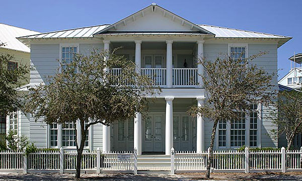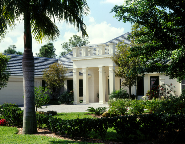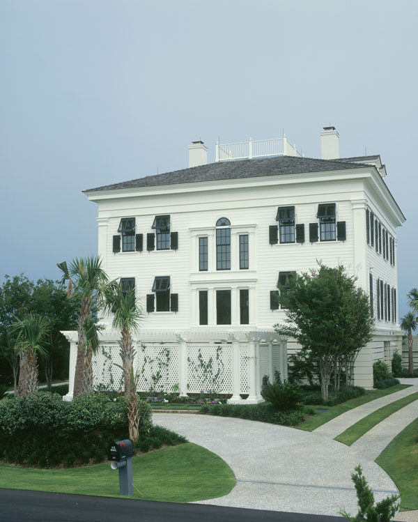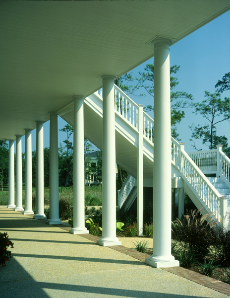 The southern facade features a pergola of Chadsworth PolyStoneŽ columns, a Serliana window designed to allow light into the stair hall, and Bermuda shutters to shade the south-facing rooms. 10" x 8' PolyStoneŽ Tuscan Plain Tapered columns. Chadsworth Cottage Figure Eight Island, North Carolina (NC)