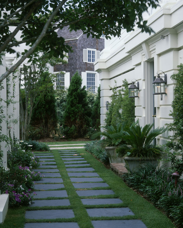 A well-manicured walkway, a pergola with climbing roses, and potted plants welcome visitors to Chadsworth Cottage New Old House Magazine Figure Eight Island, North Carolina (NC)