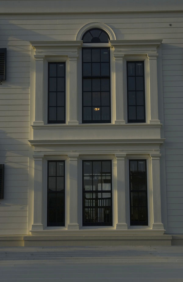 Lighting the three-story stair hall is a Serliana window. Each window opening was framed separately with Chadsworth's PolyStoneŽ 8-inch-wide pilasters to create window surrounds.