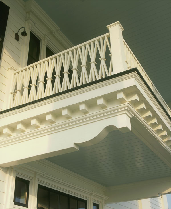 View up to the balcony; bundled wheat railings. Chadsworth Cottage New Old House Magazine